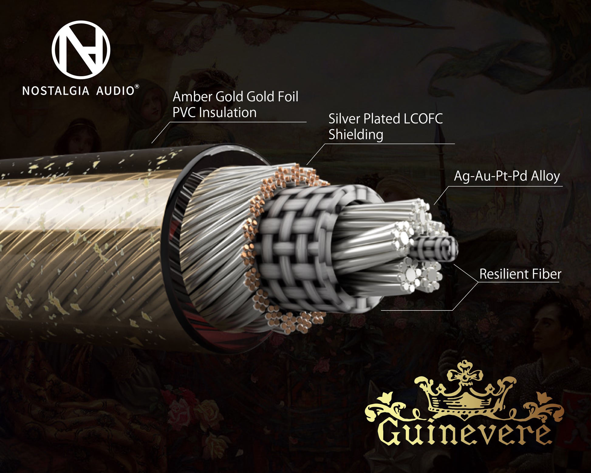 Nostalgia Audioの音響工芸の旅は2020年、初のイヤホンアップグレードケーブル「Gandalf」の発表と共に始まりました。それから5年にわたる専念的な研究と革新を経て、私たちはこのたび、五周年記念製品「Guinevere」を誇りを持ってご紹介します。Guinevereは、当社の工芸の頂点を象徴する画期的なケーブルであり、金、銀、プラチナ、パラジウム合金をLitz構造と融合させた世界初の製品として誕生しました。この傑作は、音響芸術への揺るぎない追求を体現し、高級オーディオアクセサリーの新たな基準を確立するとともに、「真の芸術は細部への徹底したこだわりに宿る」という私たちの信念を具現化しています。細部にまで込められた極致のこだわりが、究極の完成度を実現するのです。